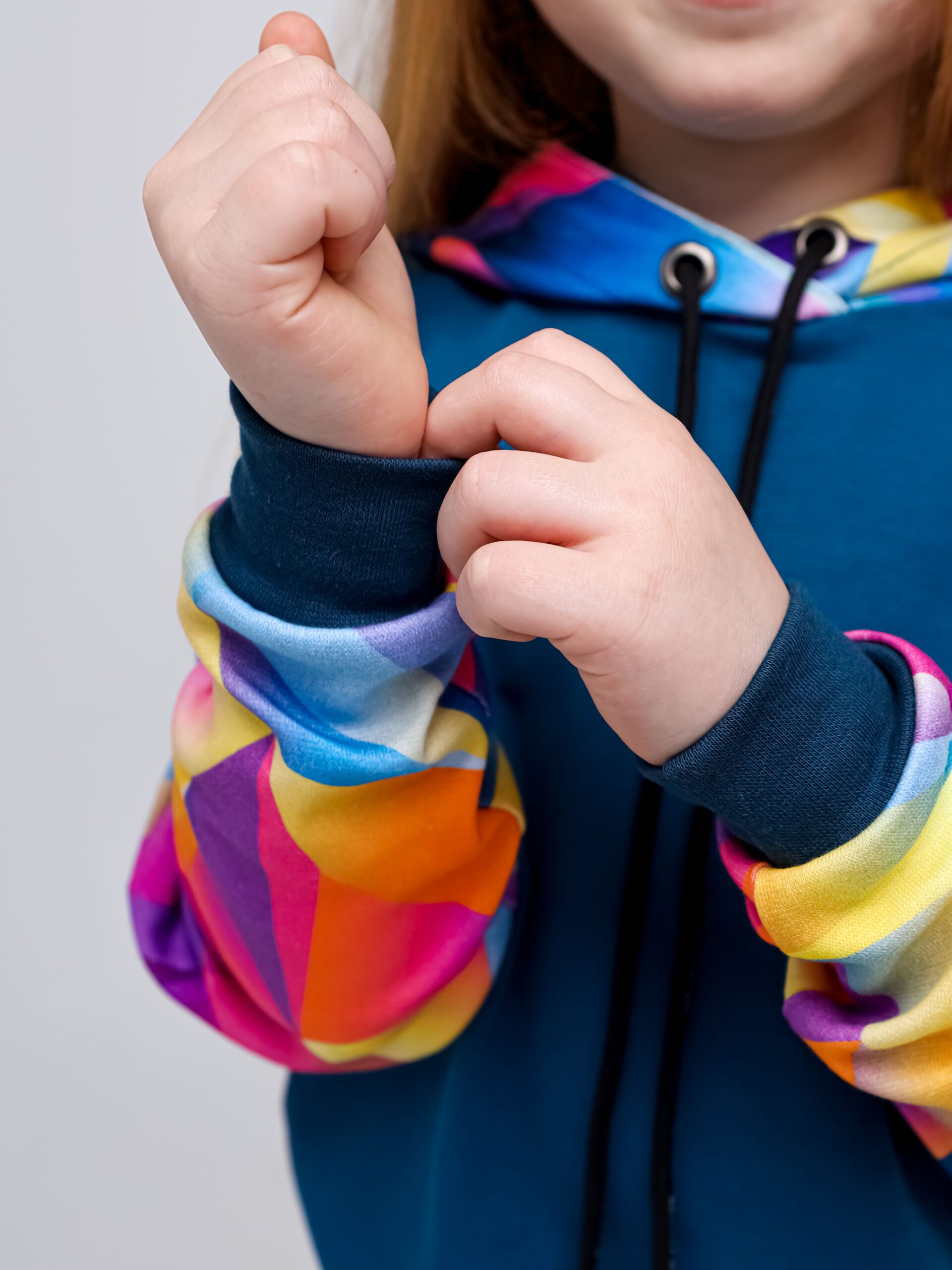 Худи с капюшоном свободного кроя имеет яркие вставки по бокам и яркие рукава, что поможет Вам всегда легко находить своего ребенка в компании на площадке. Рукава на плотной эластичной манжете, по низу изделия так же плотный эластичный пояс.