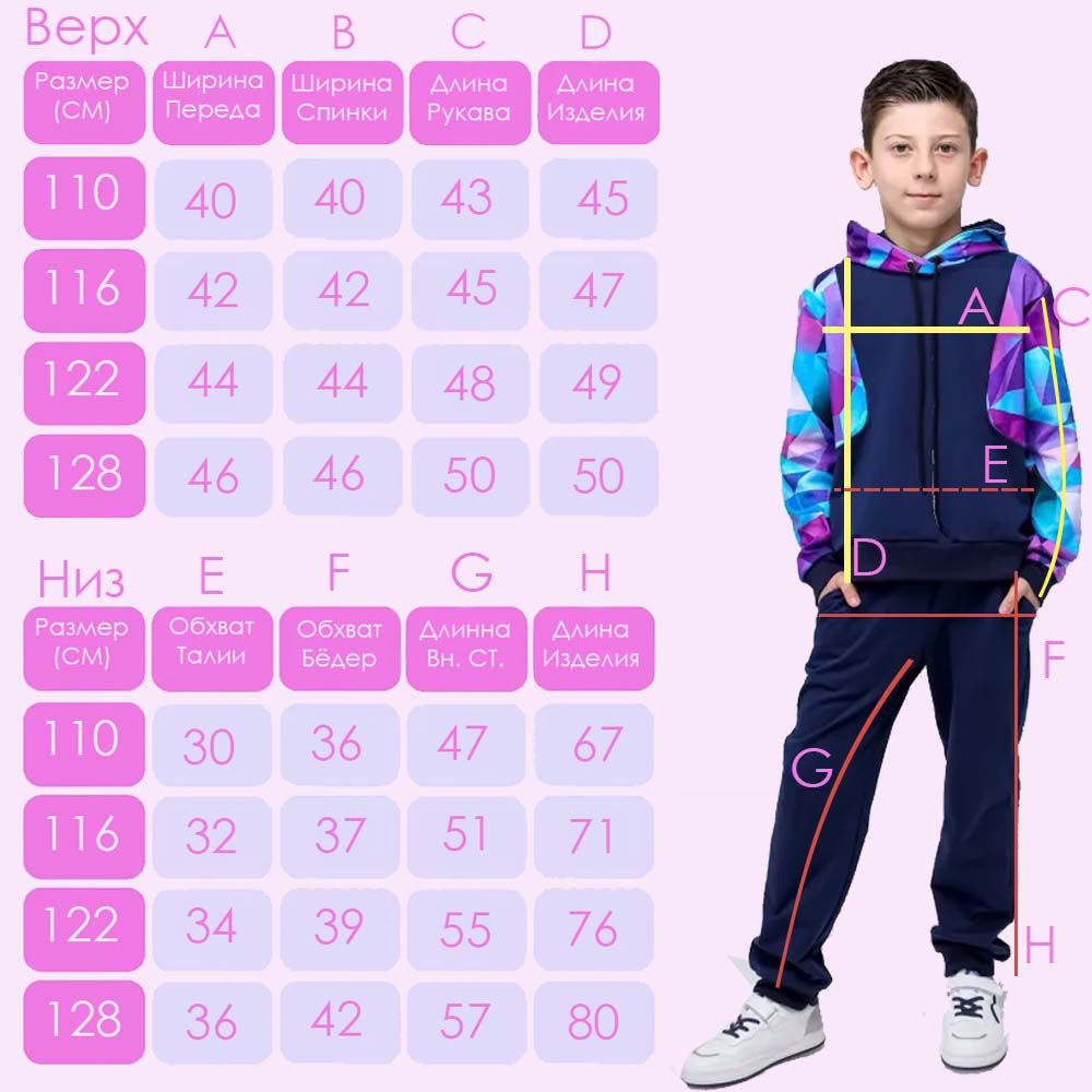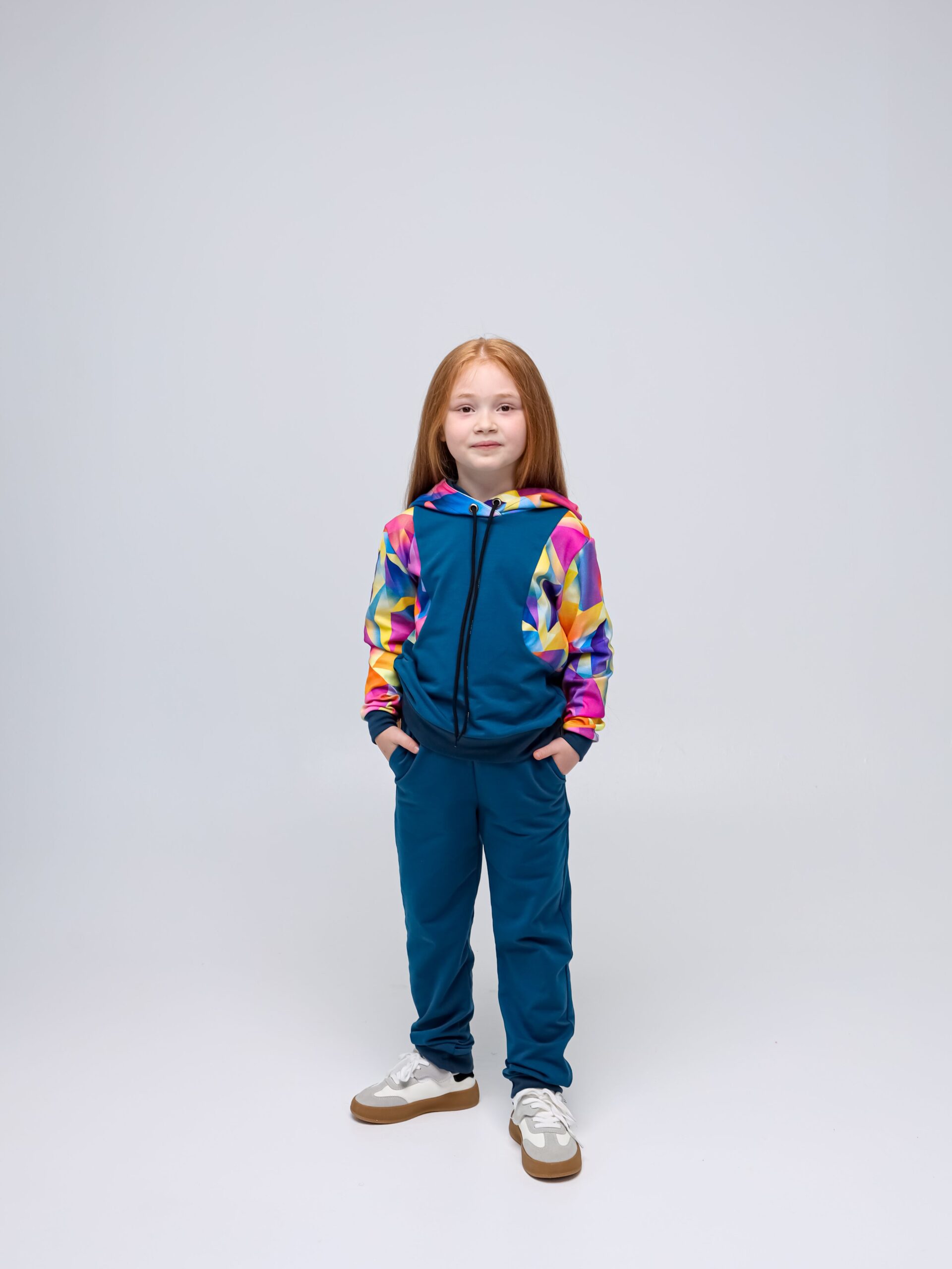 Костюм спортивный детский из футера без начеса удобный и стильный, включающий в себя два предмета: худи с капюшоном и брюки-джоггеры.